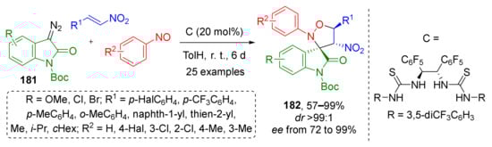 - Gupta, E.; Zaheer, M.K.; Kant, R.; Mohanan, K. Additive-free regio- and diastereoselective construction of fully-substituted isoxazolidines employing diazo compounds. Org. Chem. Front. 2019, 6, 1109–1113. [Google Scholar] [CrossRef]