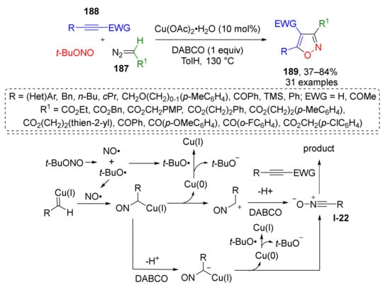 - Wang, X.D.; Zhu, L.H.; Liu, P.; Wang, X.Y.; Yuan, H.Y.; Zhao, Y.L. Copper-Catalyzed Cascade Cyclization Reactions of Diazo Compounds with tert-Butyl Nitrite and Alkynes: One-Pot Synthesis of Isoxazoles. J. Org. Chem. 2019, 84, 16214–16221. [Google Scholar] [CrossRef]