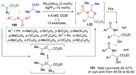 - Xi, J.-B.; Ma, M.-L.; Hu, W. Rh2(OAc)4 and InCl3 co-catalyzed diastereoselective trapping of carbamate ammonium ylides with aldehydes for the synthesis of β-hydroxyl-α-amino acid derivatives. Tetrahedron 2016, 72, 579–583. [Google Scholar] [CrossRef]