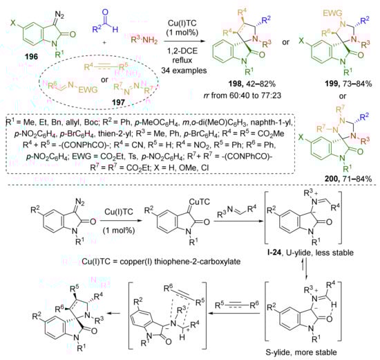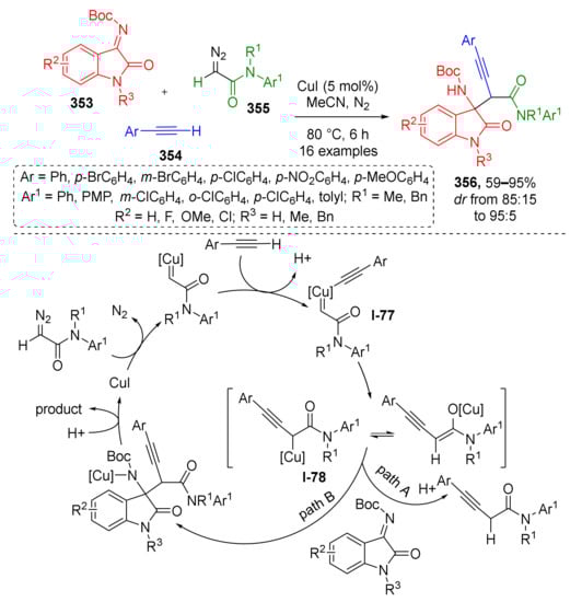 - Che, J.; Gopi Krishna Reddy, A.; Niu, L.; Xing, D.; Hu, W. Cu(I)-Catalyzed Three-Component Reaction of alpha-Diazo Amide with Terminal Alkyne and Isatin Ketimine via Electrophilic Trapping of Active Alkynoate-Copper Intermediate. Org. Lett. 2019, 21, 4571–4574. [Google Scholar] [CrossRef]