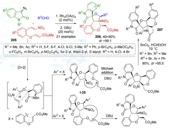 - Reddy, B.V.S.; Karthik, G.; Rajasekaran, T.; Sridhar, B. Stereoselective Synthesis of Highly Functionalized Dispirooxindoles through [3+2] Cycloaddition of Carbonyl Ylides with 3-Arylideneoxindoles. Eur. J. Org. Chem. 2015, 2015, 2038–2041. [Google Scholar] [CrossRef]