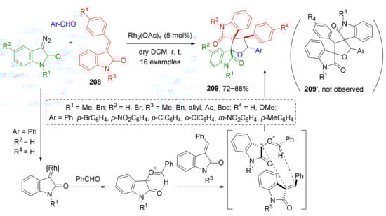 - Muthusamy, S.; Ramkumar, R. Rhodium(II) catalyzed highly diastereoselective synthesis of conformationally restricted dispiro[1,3-dioxolane]bisoxindoles. Tetrahedron 2014, 70, 5594–5607. [Google Scholar] [CrossRef]