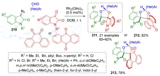 Diazo compounds, in turn, are reagents with unique and surprisingly diverse reactivity modes, including transformations with both the retention of nitrogen atoms and the elimination of dinitrogen during their thermal, catalytic, or photolytic activation. They find their application in obtaining a variety of privileged in drug design motifs, such as a wide range of heterocyclic systems [4] and spirocyclic scaffolds [5], as well as in the synthesis of natural compounds [6] and the modification of biomolecules [7]. Given the vast and varied synthetic applications of diazo reagents, it is not surprising that they have found their implementation in MCRs. Nowadays, exploring the potential of diazo compounds for multicomponent approach is one of the most rapidly developing areas and this review is aimed at summarizing these recent achievements.