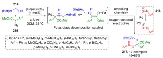- Han, W.; Yu, J.; Kang, Z.; Song, L.; Pi, R.; Dong, S.; Xiong, Y.; Xia, F.; Li, Z.; Liu, S. Dual Functional Pd-Catalyzed Multicomponent Reaction by Umpolung Chemistry of the Oxygen Atom in Electrophiles. J. Org. Chem. 2021, 86, 6847–6854. [Google Scholar] [CrossRef]