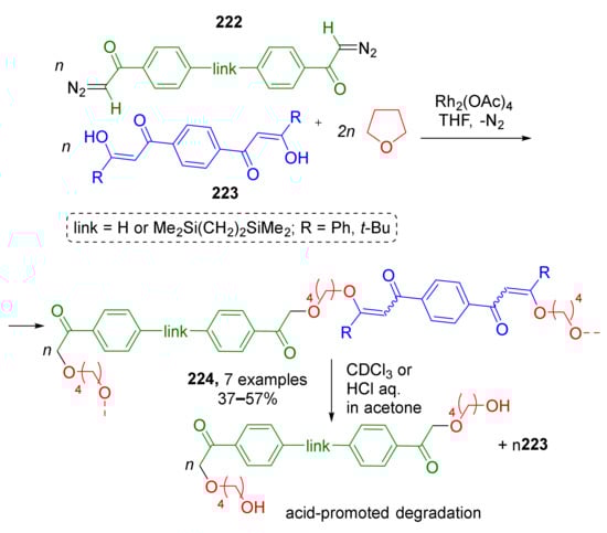 - Shimomoto, H.; Mori, T.; Itoh, T.; Ihara, E. Poly(β-keto enol ether) Prepared by Three-Component Polycondensation of Bis(diazoketone), Bis(1,3-diketone), and Tetrahydrofuran: Mild Acid-Degradable Polymers To Afford Well-Defined Low Molecular Weight Components. Macromolecules 2019, 52, 5761–5768. [Google Scholar] [CrossRef]
