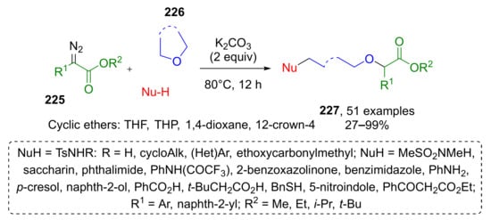 - Lu, L.; Chen, C.; Jiang, H.; Yin, B. Three-Component Ring-Opening Reactions of Cyclic Ethers, alpha-Diazo Esters, and Weak Nucleophiles under Metal-Free Conditions. J. Org. Chem. 2018, 83, 14385–14395. [Google Scholar] [CrossRef] [PubMed]