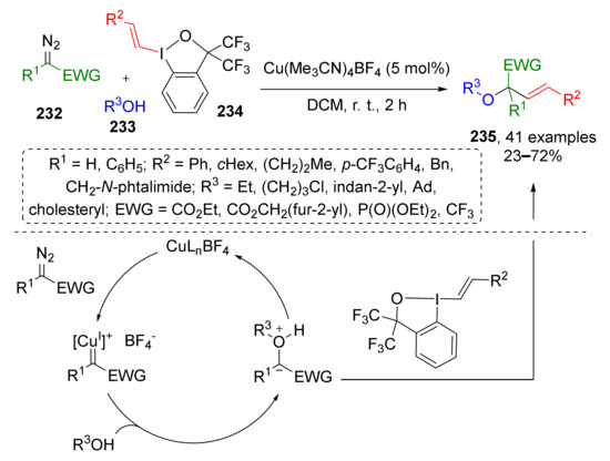 - Pisella, G.; Gagnebin, A.; Waser, J. Copper-Catalyzed Oxyvinylation of Diazo Compounds. Org. Lett. 2020, 22, 3884–3889. [Google Scholar] [CrossRef] [PubMed]