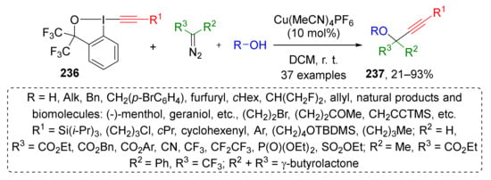 - Pisella, G.; Gagnebin, A.; Waser, J. Three-Component Reaction for the Synthesis of Highly Functionalized Propargyl Ethers. Chemistry 2020, 26, 10199–10204. [Google Scholar] [CrossRef]