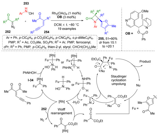 - Chen, L.; Wang, K.; Shao, Y.; Sun, J. Stereoselective Synthesis of Fully Substituted beta-Lactams via Metal-Organo Relay Catalysis. Org. Lett. 2019, 21, 3804–3807. [Google Scholar] [CrossRef]