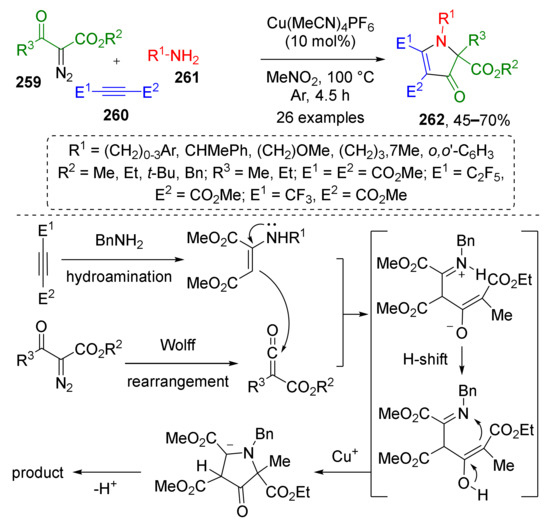 - Wu, H.; Li, X.; Yan, Z.; Ma, N.; Song, S.; Zhang, G.; Jiao, N. Cu(I)-Catalyzed [2 + 2 + 1] Cycloaddition of Amines, Alkynes, and Ketenes: An Umpolung and Regioselective Approach to Full-Substituted beta-Pyrrolinones. Org. Lett. 2021, 23, 762–766. [Google Scholar] [CrossRef] [PubMed]