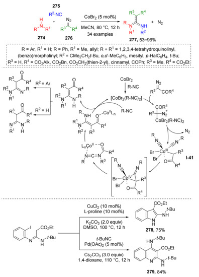 - Gu, Z.-Y.; Han, H.; Li, Z.-Y.; Ji, S.-J.; Xia, J.-B. Catalytic synthesis of functionalized amidines via cobalt-carbene radical coupling with isocyanides and amines. Org. Chem. Front. 2021, 8, 1544–1550. [Google Scholar] [CrossRef]