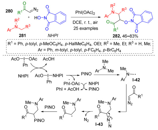 - Wang, N.N.; Hao, W.J.; Zhang, T.S.; Li, G.; Wu, Y.N.; Tu, S.J.; Jiang, B. Metal-free C(sp(3))-H functionalization: Oxidative carbo-oxygenation of alpha-diazo carbonyls via radical dediazotization. Chem. Commun. 2016, 52, 5144–5147. [Google Scholar] [CrossRef] [Green Version]