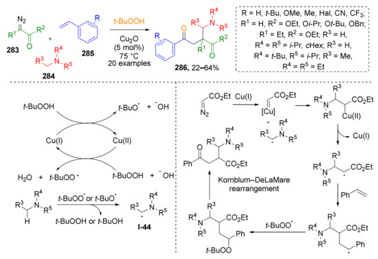 - Yu, J.; Chen, L.; Sun, J. Copper-Catalyzed Oxy-aminomethylation of Diazo Compounds with N, O-Acetals. Org. Lett. 2019, 21, 1664–1667. [Google Scholar] [CrossRef]