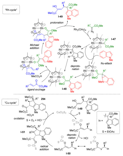- Jiang, L.; Jin, W.; Hu, W. Double C–H Functionalization of Indoles via Three-Component Reactions/CuCl2-Catalyzed Aerobic Dehydrogenative Coupling for the Synthesis of Polyfunctional Cyclopenta[b]indoles. ACS Catal. 2016, 6, 6146–6150. [Google Scholar] [CrossRef]