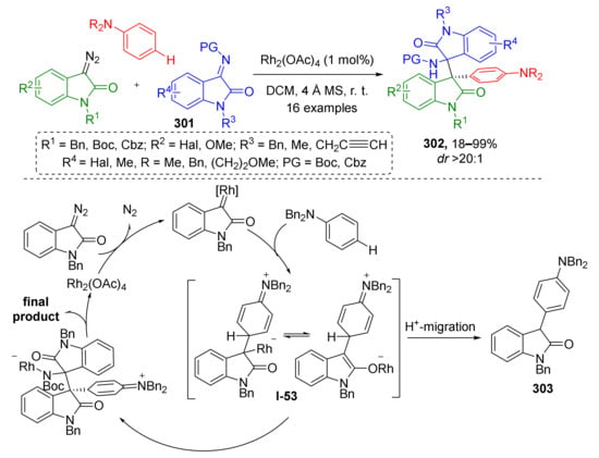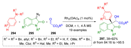 - Jia, S.K.; Song, L.L.; Lei, Y.B.; Gopi Krishna Reddy, A.; Xing, D.; Hu, W.H. A Rh(ii)-catalyzed three-component reaction of 3-diazooxindoles with N,N-disubstituted anilines and glyoxylates for the synthesis of 3-aryl-3-substituted oxindoles. Org. Biomol. Chem. 2016, 14, 10157–10160. [Google Scholar] [CrossRef]