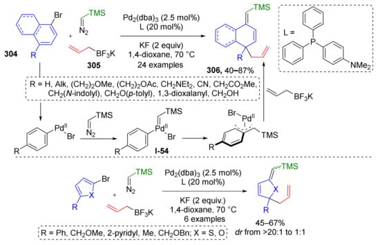- Komatsuda, M.; Kato, H.; Muto, K.; Yamaguchi, J. Pd-Catalyzed Dearomative Three-Component Reaction of Bromoarenes with Diazo Compounds and Allylborates. ACS Catal. 2019, 9, 8991–8995. [Google Scholar] [CrossRef]