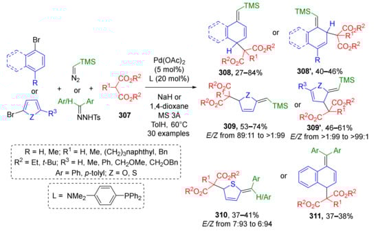 - Wu, G.; Deng, Y.; Luo, H.; Li, T.; Zhang, Y.; Wang, J. Palladium-Catalyzed Cascade Reactions ofα-Halo-N-Tosylhydrazones, Indoles, and Aryl Iodides. Asian J. Org. Chem. 2016, 5, 874–877. [Google Scholar] [CrossRef]
