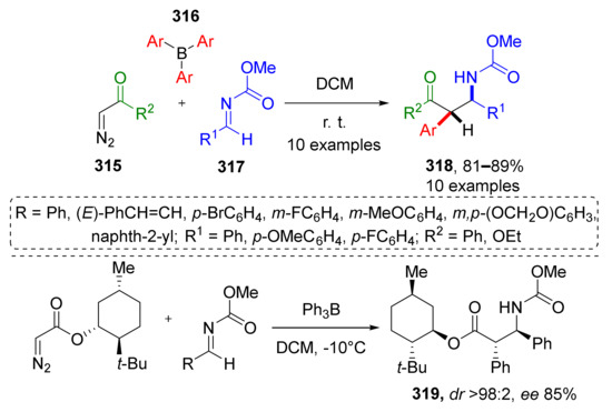 - Luan, Y.; Yu, J.; Zhang, X.; Schaus, S.E.; Wang, G. Diastereoselective three-component synthesis of beta-amino carbonyl compounds using diazo compounds, boranes, and acyl imines under catalyst-free conditions. J. Org. Chem. 2014, 79, 4694–4698. [Google Scholar] [CrossRef]