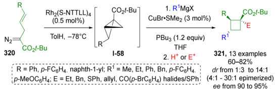 - Panish, R.; Chintala, S.R.; Boruta, D.T.; Fang, Y.; Taylor, M.T.; Fox, J.M. Enantioselective synthesis of cyclobutanes via sequential Rh-catalyzed bicyclobutanation/Cu-catalyzed homoconjugate addition. J. Am. Chem. Soc. 2013, 135, 9283–9286. [Google Scholar] [CrossRef] [Green Version]