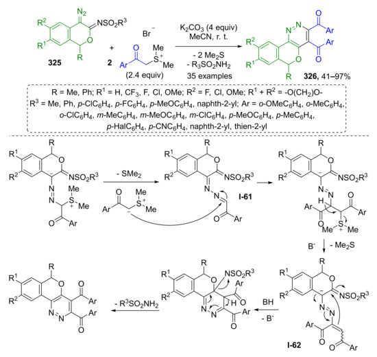 - Suleman, M.; Xie, J.; Wang, Z.; Lu, P.; Wang, Y. Base Promoted Three-Component Annulation of 4-Diazoisochroman-3-imines with Dimethylsulfonium Ylides: Synthesis of Highly Functionalized Isochromeno[4,3-c]pyridazines. J. Org. Chem. 2021, 86, 455–465. [Google Scholar] [CrossRef] [PubMed]