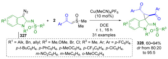 - Suleman, M.; Li, Z.; Lu, P.; Wang, Y. Copper-Catalyzed Dimerization of Sulfoxonium Ylides with 3-Diazoindolin-2-imines: A Practical and Efficient Approach to Spiro[cyclopropane-1,3′-indolin]-2′-imines. Eur. J. Org. Chem. 2019, 2019, 4447–4456. [Google Scholar] [CrossRef]