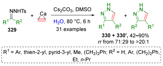Another type of pyrazoles 53, namely, 3,4-disubstitued, were prepared via a similar approach reported by K. Mohanan and co-authors in 2017 (Scheme 14) [25]. In this case alkene was generated via Horner–Wadsworth–Emmons reaction of aromatic or heteroaromatic aldehydes 50 and ketophosphonates 51. The third reaction partner, terminal diazo sulfone, was also generated in situ—by base-promoted diacylation of corresponding diazo keto sulfone 52. Initial cycloaddition product, trisubstituted sulfonyl pyrazoline, was aromatized via desulfonylation reaction with elimination of MeSO2H.