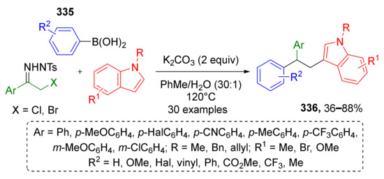 - Wu, G.; Deng, Y.; Luo, H.; Zhou, J.; Li, T.; Zhang, Y.; Wang, J. Transition-metal-free cascade reaction of alpha-halo-N-tosylhydrazones, indoles and arylboronic acids. Chem. Commun. 2016, 52, 5266–5268. [Google Scholar] [CrossRef]
