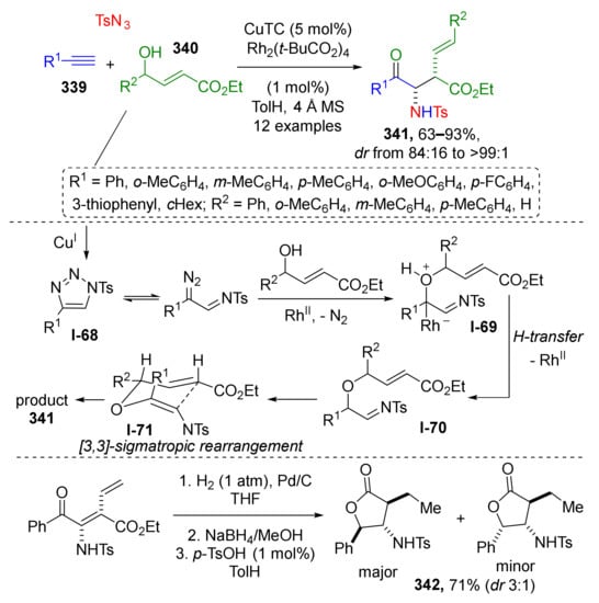 - Jung, D.J.; Jeon, H.J.; Lee, J.H.; Lee, S.G. Cu(I)/Rh(II)-Catalyzed Tandem Convergent Multicomponent Reaction for the Regio- and Stereocontrolled Synthesis of gamma-Oxo-beta-amino Esters. Org. Lett. 2015, 17, 3498–3501. [Google Scholar] [CrossRef]