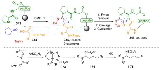 - Bucci, R.; Dapiaggi, F.; Macut, H.; Pieraccini, S.; Sironi, M.; Gelmi, M.L.; Erba, E.; Pellegrino, S. On-resin multicomponent 1,3-dipolar cycloaddition of cyclopentanone-proline enamines and sulfonylazides as an efficient tool for the synthesis of amidino depsipeptide mimics. Amino Acids 2020, 52, 15–24. [Google Scholar] [CrossRef]