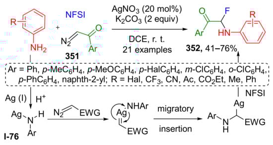 - Huang, J.; Li, L.; Chen, H.; Xiao, T.; He, Y.; Zhou, L. Silver-catalyzed geminal aminofluorination of diazoketones with anilines and N-fluorobenzenesulphonimide. Org. Chem. Front. 2017, 4, 529–533. [Google Scholar] [CrossRef]