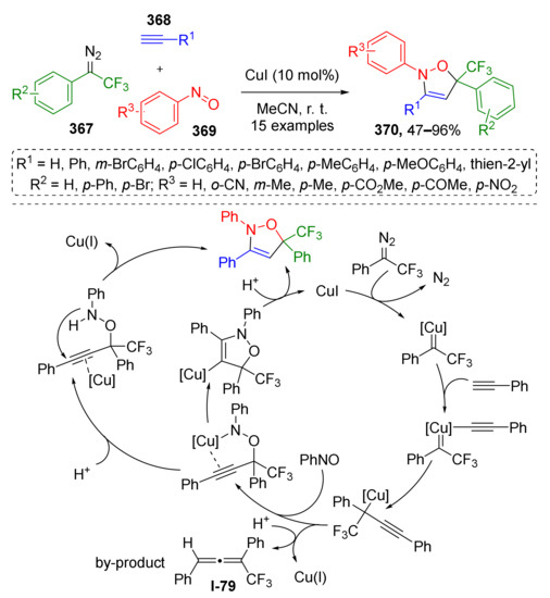 - Lv, X.; Kang, Z.; Xing, D.; Hu, W. Cu(I)-Catalyzed Three-Component Reaction of Diazo Compound with Terminal Alkyne and Nitrosobenzene for the Synthesis of Trifluoromethyl Dihydroisoxazoles. Org. Lett. 2018, 20, 4843–4847. [Google Scholar] [CrossRef] [PubMed]