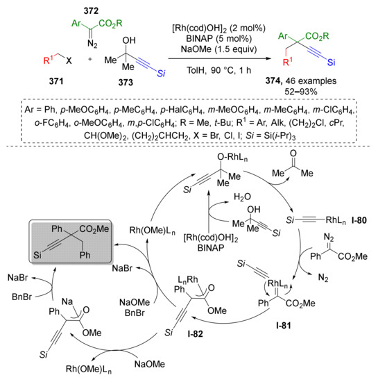 - Xia, Y.; Feng, S.; Liu, Z.; Zhang, Y.; Wang, J. Rhodium(I)-Catalyzed Sequential C(sp)-C(sp(3)) and C(sp(3))-C(sp(3)) Bond Formation through Migratory Carbene Insertion. Angew. Chem. 2015, 54, 7891–7894. [Google Scholar] [CrossRef] [PubMed]