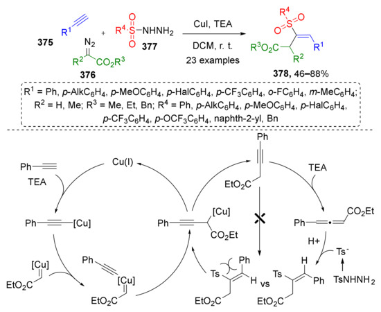 - Sun, Q.; Li, L.; Liu, L.; Yang, Y.; Zha, Z.; Wang, Z. Copper-catalyzed 1,1-difunctionalization of terminal alkynes: A three-component reaction for the construction of vinyl sulfones. Sci. China Chem. 2019, 62, 904–908. [Google Scholar] [CrossRef]