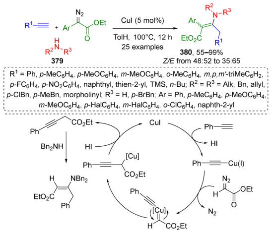 - Gao, B.; Huang, H. Copper-Catalyzed Difunctionalization of Terminal Alkynes with Diazo Esters and Amines to Construct β-Enamino Esters. Adv. Synth. Catal. 2016, 358, 4075–4084. [Google Scholar] [CrossRef]