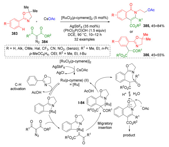 - Kumar, G.S.; Khot, N.P.; Kapur, M. Oxazolinyl-Assisted Ru(II)-Catalyzed C−H Functionalization Based on Carbene Migratory Insertion: A One-Pot Three-Component Cascade Cyclization. Adv. Synth. Catal. 2018, 361, 73–78. [Google Scholar] [CrossRef]