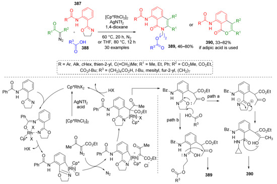 - Zhang, X.; Wang, P.; Zhu, L.; Chen, B. Rhodium(III)-catalyzed chemodivergent annulations between phenyloxazoles and diazos via C–H activation. Chin. Chem. Lett. 2021, 32, 695–699. [Google Scholar] [CrossRef]