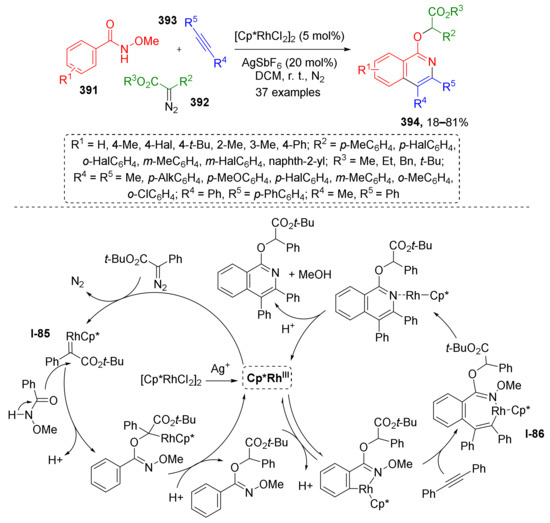 - Zhou, C.; Jiang, J.; Wang, J. Three-Component Synthesis of Isoquinoline Derivatives by a Relay Catalysis with a Single Rhodium(III) Catalyst. Org. Lett. 2019, 21, 4971–4975. [Google Scholar] [CrossRef] [PubMed]