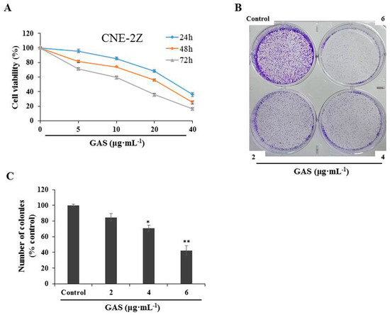 Inhibitory role of GAS on CNE-2Z cells. (A) CNE-2Z cells were treated with increasing concentrations (0, 5, 10, 20, and 40 μg·mL−1) of GAS for 24, 48, and 72 h. Cell viability was measured through an MTT assay. (B) The colony forming capability of CNE-2Z cells was measured using a colony formation assay after being treated with low concentrations (0, 2, 4, and 6 μg·mL−1) of GAS for 5 days. (C) Quantification of the colony-forming capability of CNE-2Z cells inhibited by GAS. * p < 0.05 and ** p < 0.01 compared with the control.