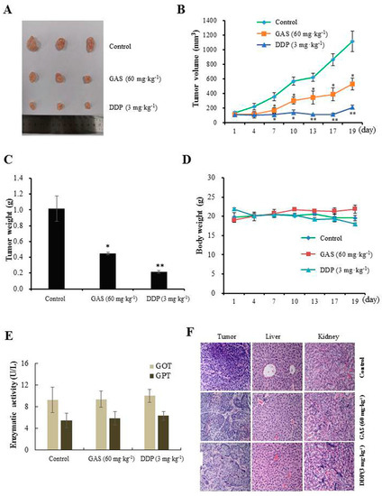 Anti-tumor efficacy of GAS on CNE-2Z cells xenograft in nude mice (n = 3). (A) Representative images of subcutaneous xenograft tumors from each treatment group. (B) Measurements of tumor volume. (C) Measurements of tumor weight after treatment for 19 days. (D) Body weight of mice. (E) Serum GOT and GPT levels as determined using an assay kit. (F) H&E staining of tumors, livers, and kidneys from mice after treatment (magnification: 200×). * p < 0.05 and ** p < 0.01 compared to the control.