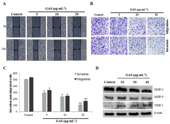 GAS suppressed invasion and migration of CNE-2Z cells. (A) Migration was analyzed by a wound-healing assay after being treated with various concentrations (5, 10, and 20 μg·mL−1) of GAS. (B) Cell invasion and migration were determined using a transwell assay after treatment with GAS (5, 10, and 20 μg·mL−1). (C) Quantification of invasion and migration of CNE-2Z cells suppressed by GAS. (D) Western blotting analyses of MMP-2, MMP-9, and TIMP-1 levels in CNE-2Z cells. β-Actin was used as an internal control. * p < 0.05 and ** p < 0.01 compared to the control.