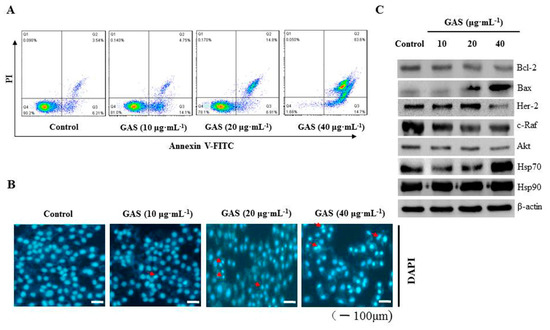 We further investigated if the effect of GAS on CNE-2Z cell death involved apoptosis by using flow cytometry. As shown in Figure 4A, GAS significantly induced CNE-2Z cell apoptosis in a concentration-dependent manner. Moreover, DAPI staining revealed that specific morphological characteristics of apoptosis, such as bright nuclear condensation, occurred after increasing the concentration of GAS (Figure 4B). Western blotting results showed that GAS induced the degradation of Hsp90 client proteins (Her-2, c-Raf, Akt, and Bcl-2) and increased the expression of Bax and Hsp70, whereas it did not affect Hsp90 expression in CNE-2Z cells (Figure 4C and Figure S2). These findings indicate that GAS can induce apoptosis of CNE-2Z cells via the inhibition of Hsp90 client proteins.