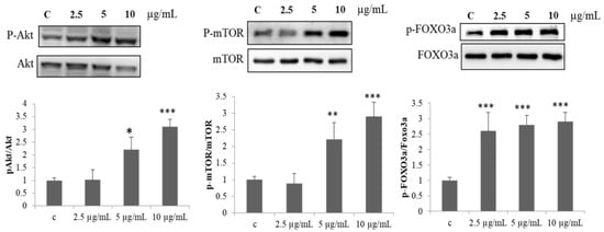 In addition, the activation of mTOR by Akt is an important event in the skeletal myogenesis. To evaluate the potential to induce myogenic differentiation, the effect of PPH902 in activating Akt/mTOR signalling was assessed. The administration of 2.5, 5 and 10 μg/mL of PPH902 increased the phosphorylation and activation of kinases ERK, Akt and mTOR that are associated with muscle protein synthesis and elevated the regulatory phosphorylation of pro-apoptotic and matrix transcription factor FOXO3A (Figure 2).