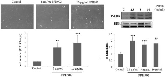Effect of PPH902 on cell proliferation. Representative Western blotting shows phosphorylation levels of ERK. Treatment with PPH902 showed an increase in the C2C12 cell number. *** p < 0.001 and ** p < 0.01 indicate significant differences with respect to control group.
