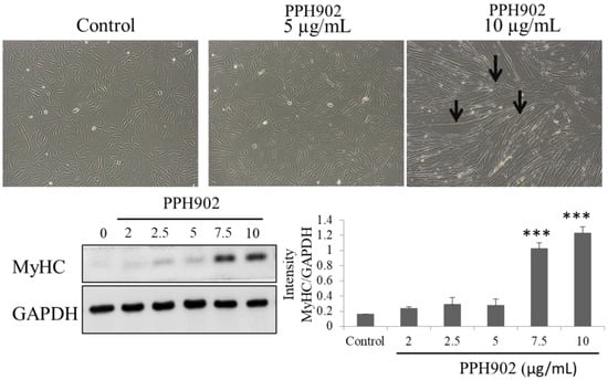 In order to understand the effects of PPH902 on muscle regeneration, their potency in inducing myogenic differentiation was examined. DMEM containing 2% horse serum induced the differentiation of C2C12 cells that are usually a flat-spindle shape to long myotubes and with thick spindle morphology within 5 days. Microscopically observing a C2C12 cell cultured in differentiation media shows that treatment with different concentrations (5 and 10 μg/mL) of PPH902 enhances myogenic differentiation (Figure 4). The myotubes in the 10 μg/mL PPH902-treated cells were clearly visible with few Y-shaped myotubes (Figure 4). In addition, analysis of the expression levels of MyHC, a muscle specific marker, indicated C2C12 differentiation. The results show a dose-dependent increase in MyHC in 5 days of PPH902 administration (Figure 4).