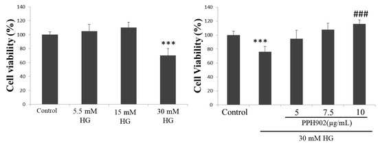 As determined using an MTT assay, the high glucose challenge in C2C12 cells decreased the viability of C2C12 cells in a dose-dependent manner. However, treatment with PPH902 improved the viability of C2C12 cells challenged with high glucose (HG) (Figure 5).