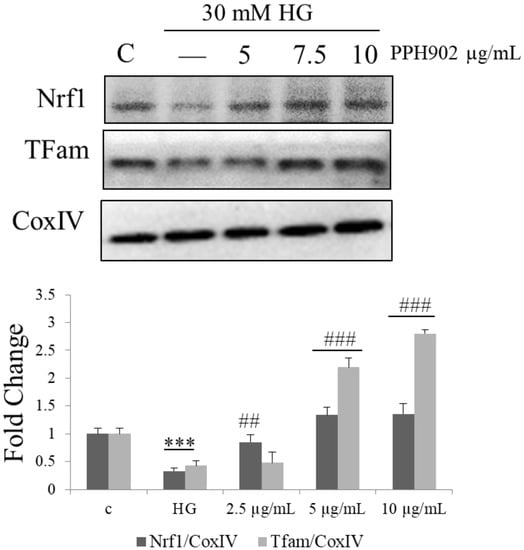 Gate keeper genes, such as PGC1 α, activate mitochondrial biogenesis in skeletal muscles by acting on their targets, such as NRF1 and TFAM. In the present study, the high glucose challenge in C2C12 cells suppressed the level of NRF-1 and TFAM and treatment with PPH902 enhanced their levels (Figure 9). Therefore, PPH902 potentially maintains mitochondrial biogenesis to enhance muscle metabolism and function.