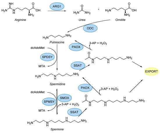 - Novita Sari, I.; Setiawan, T.; Seock Kim, K.; Toni Wijaya, Y.; Won Cho, K.; Young Kwon, H. Metabolism and Function of Polyamines in Cancer Progression. Cancer Lett. 2021, 519, 91–104. [Google Scholar] [CrossRef] [PubMed]