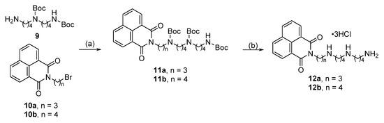 - Wang, Y.; Zhang, X.; Zhao, J.; Xie, S.; Wang, C. Nonhematotoxic Naphthalene Diimide Modified by Polyamine: Synthesis and Biological Evaluation. J. Med. Chem. 2012, 55, 3502–3512. [Google Scholar] [CrossRef]