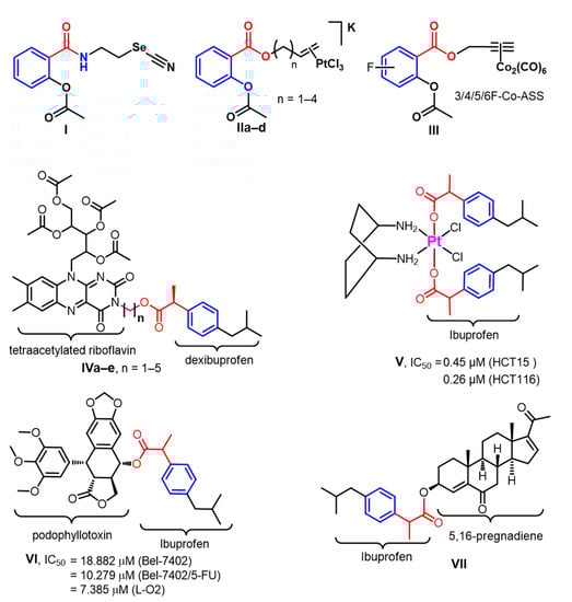 NSAIDs complexes, hybrids, and conjugates of with anticancer activities: I, Se-aspirin complex reported by [21]; IIa–c, Zeise’s Salt derivatives of acetylsalicylic acid [22]; III, cobalt alkyne derivatives of fluorinated acetylsalicylic acid [23]; IVa–e, riboflavin-dexibuprofen conjugates [24]; V, ibuprofen-kiteplatin Pt(IV) conjugate [25]; VI, ibuprofen-podophyllotoxin conjugate [26]; VII, 5,16-pregnadiene-ibuprofen hybrid [27].