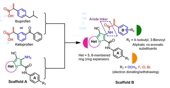 Encouraged by the above findings, we have designed a new series of hybrids (scaffold B) by incorporating the pyrrolizine/indolizine derivatives (scaffold A) with NSAIDs, Figure 3. Ibuprofen was selected as the NSAID component of the new hybrids based on the promising cytotoxic activity of VIIIb,c. In addition, ketoprofen was also selected in this study to compare the effect of the two drugs on the antiproliferative activity of the new hybrids. The aim of this selection was to compare the impact of the two drugs on cytotoxic activities of the final hybrids, Figure 3.